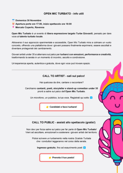 *Open Mic Turbato è un evento di libera espressione targato Turbe Giovanili, pensato per dare voce al talento turbato locale.